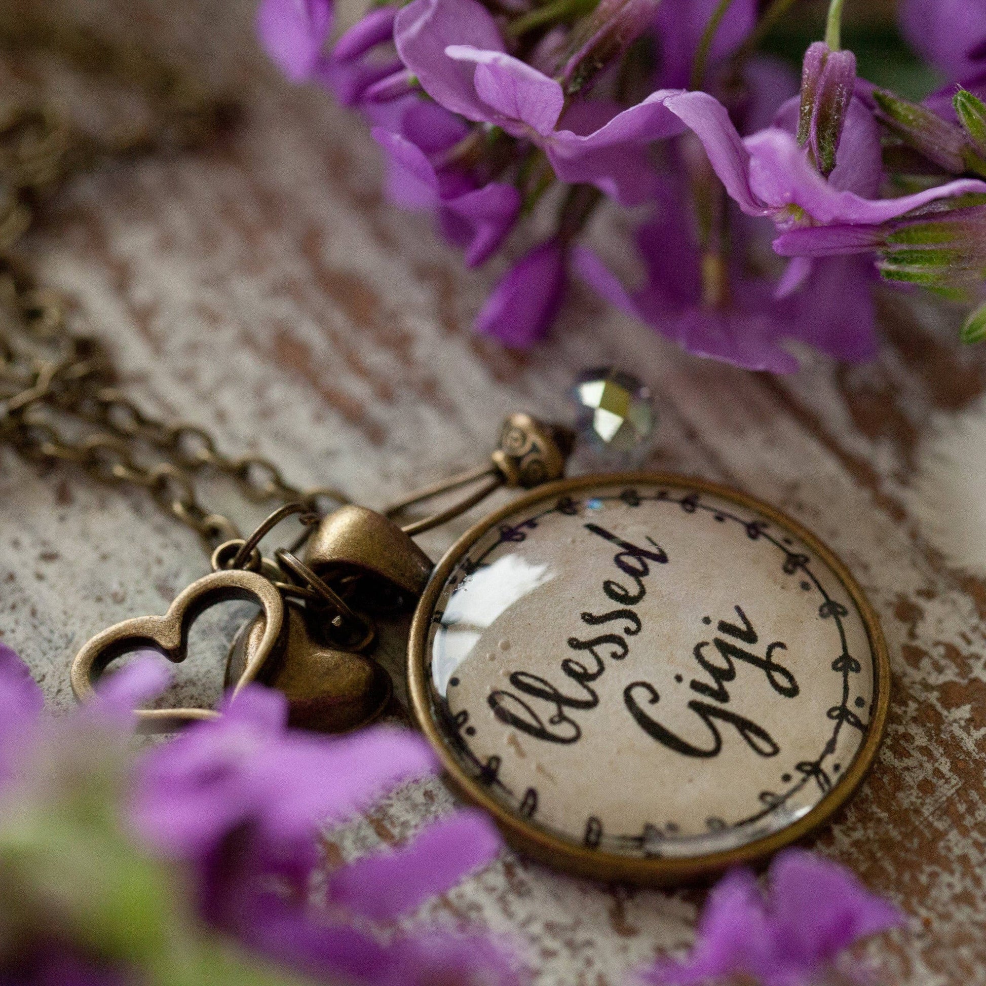 Beautiful, handcrafted necklace comes on our popular 24 inch chain. The words, "blessed Gigi," is in black ink on an antiqued hand-stained paper. Pendant Dimension - approximately 1 inch x 1 inch