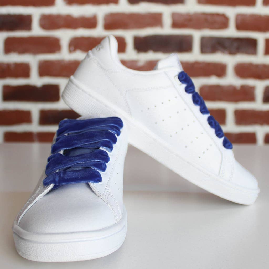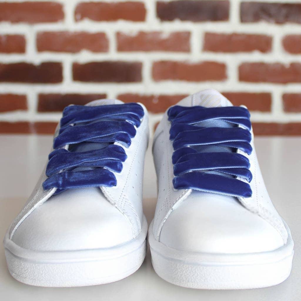 Very soft and elegant velvet laces for an old school and trendy style. Blue velvet on the front and matt woven material on the back. * Length: 120cm * Width: 1.5cm * Color: blue * Care instructions: Machine washable at 30 degrees or by hand * Packaging: Sold in pairs.