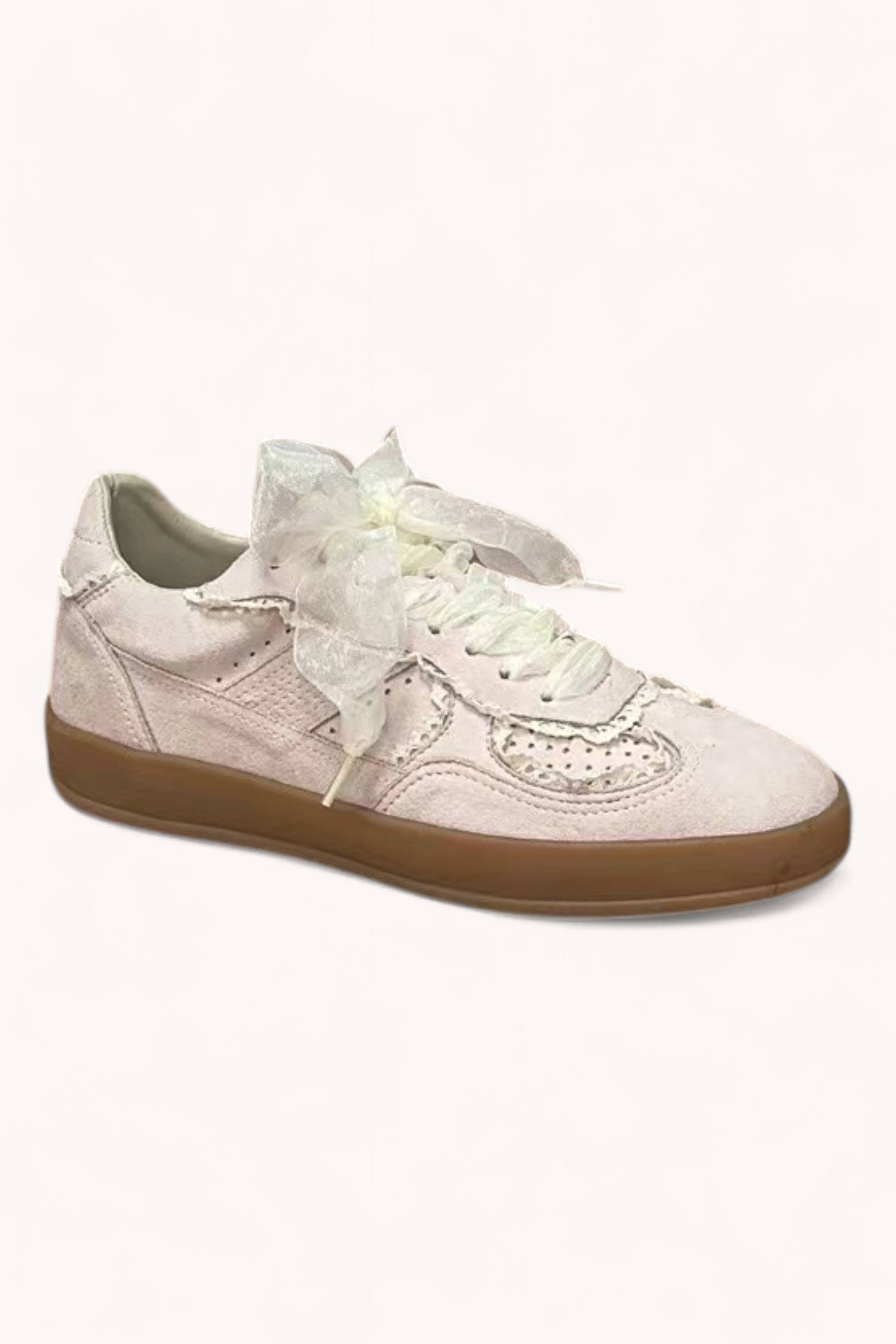 Lace trim edge design. Low sneakers. Each pair comes with 2 pairs of shoelaces (REGULAR/ORGANZA) & a perfect bow shoe charm!