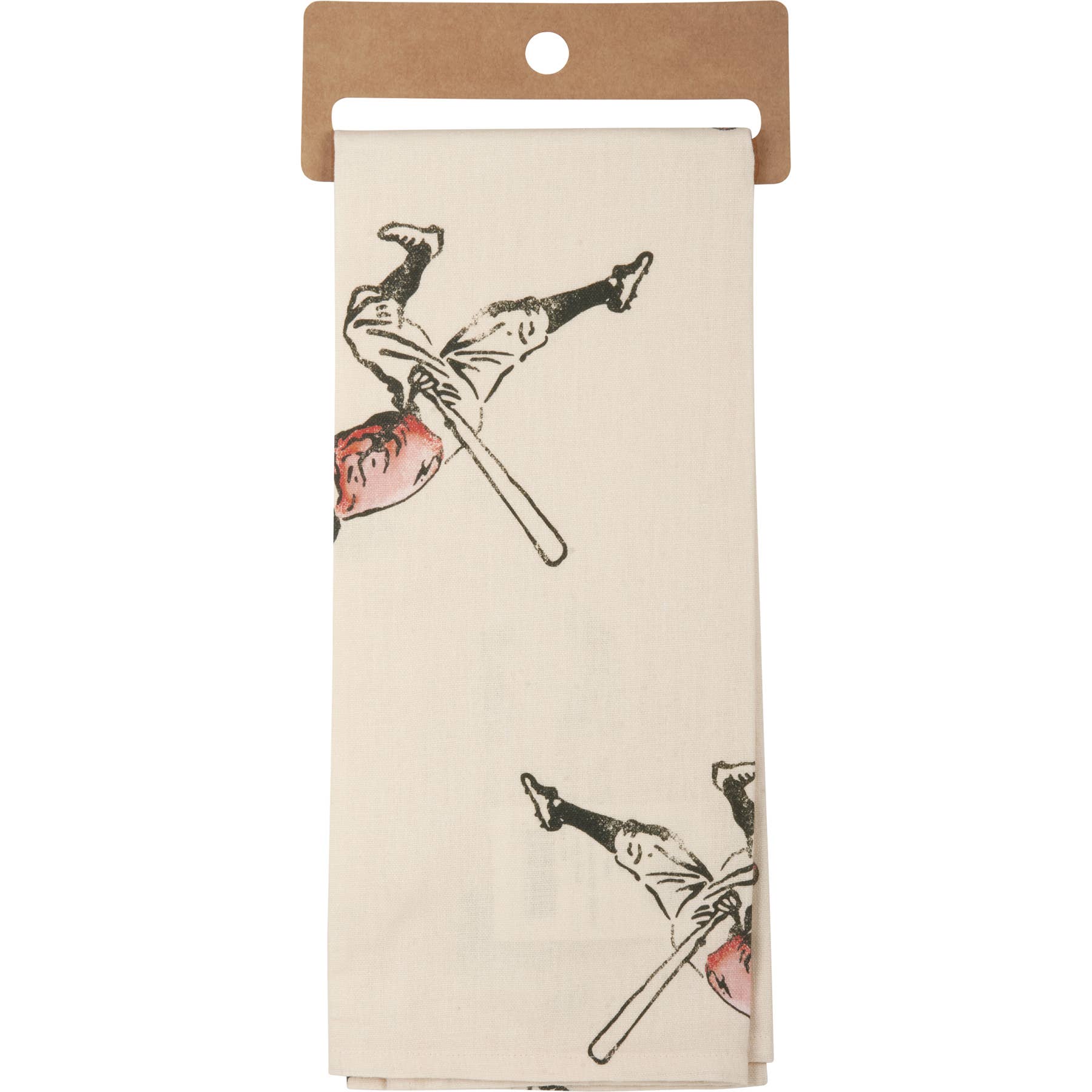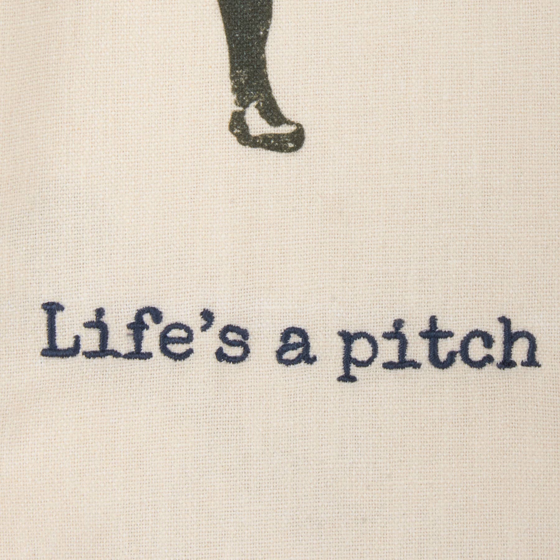 A cotton-linen kitchen towel from our Sports Collection featuring all-over vintage designs of baseball players with complementing punny sentiment reading "Life's A Pitch." Sentiment is embroidered for added interest. Towel includes cotton tape loop in corner for hanging. Our Life's A Pitch kitchen towel is machine-washable for convenient cleaning. Packaged on a cardboard hanger with hole to easily hang on rack.