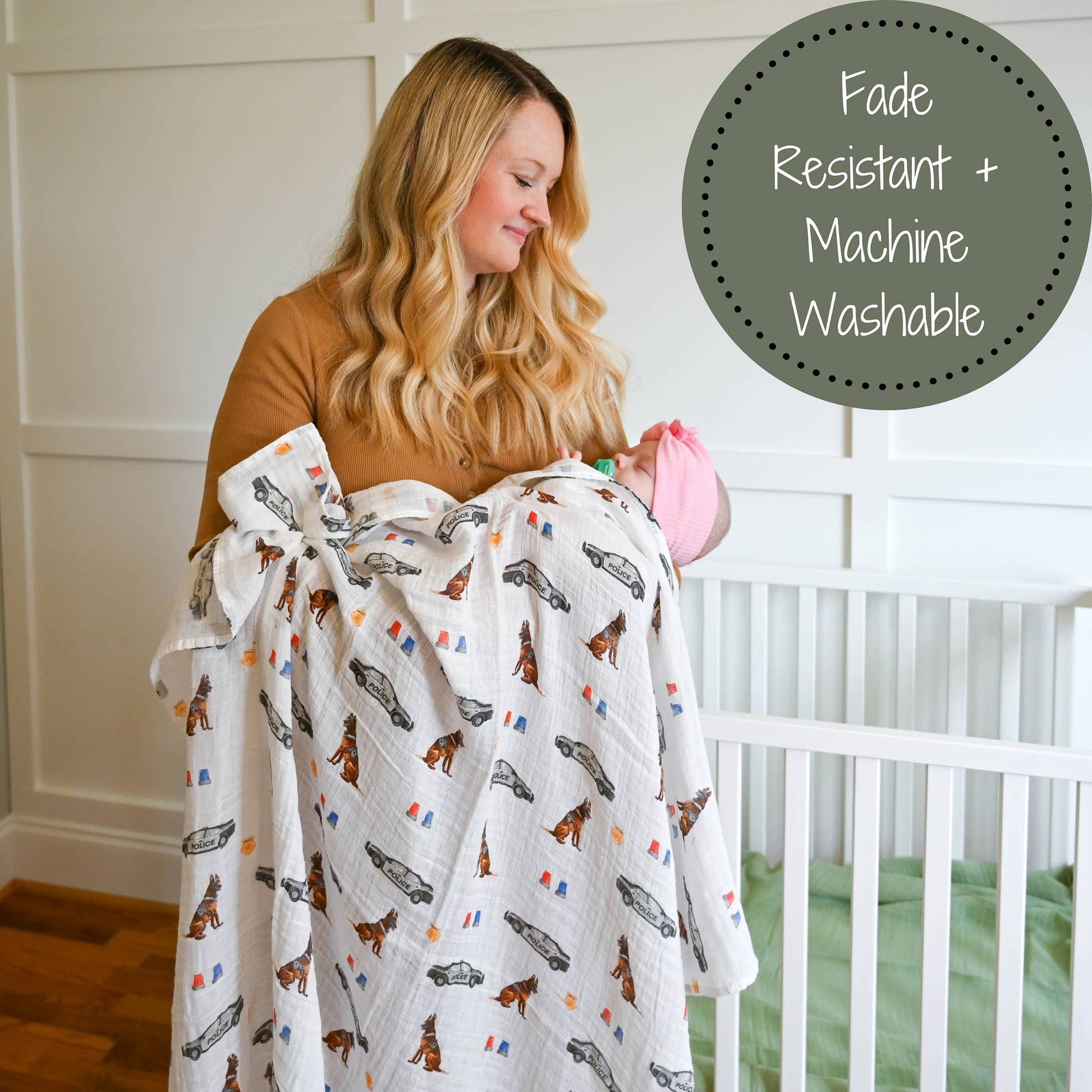 POLICE THEMED SWADDLE - This police dog print is perfect for keeping in the nursery or using as a stroller cover for your baby. Moms and dads will love receiving these as a baby shower gift or welcome present.