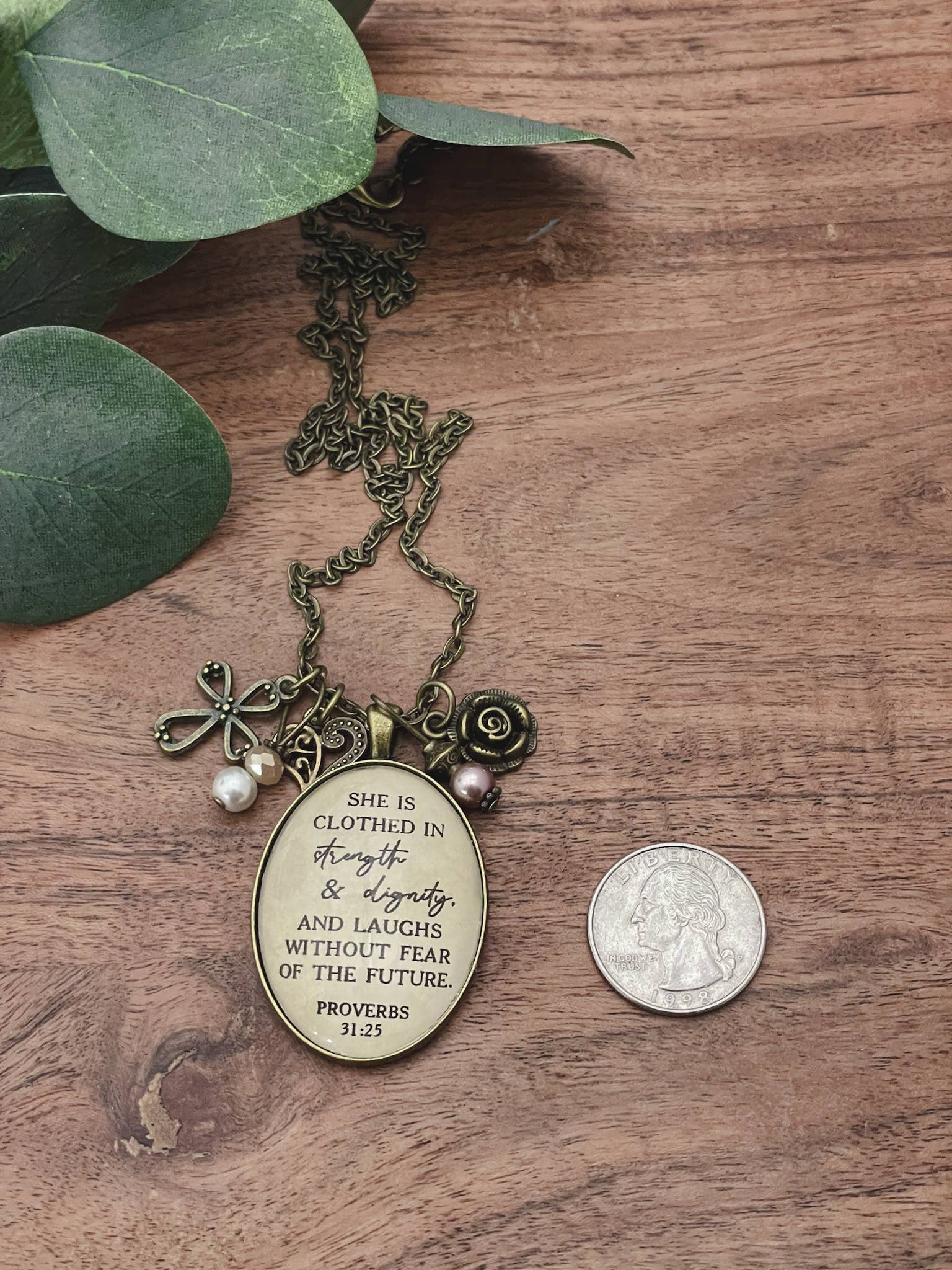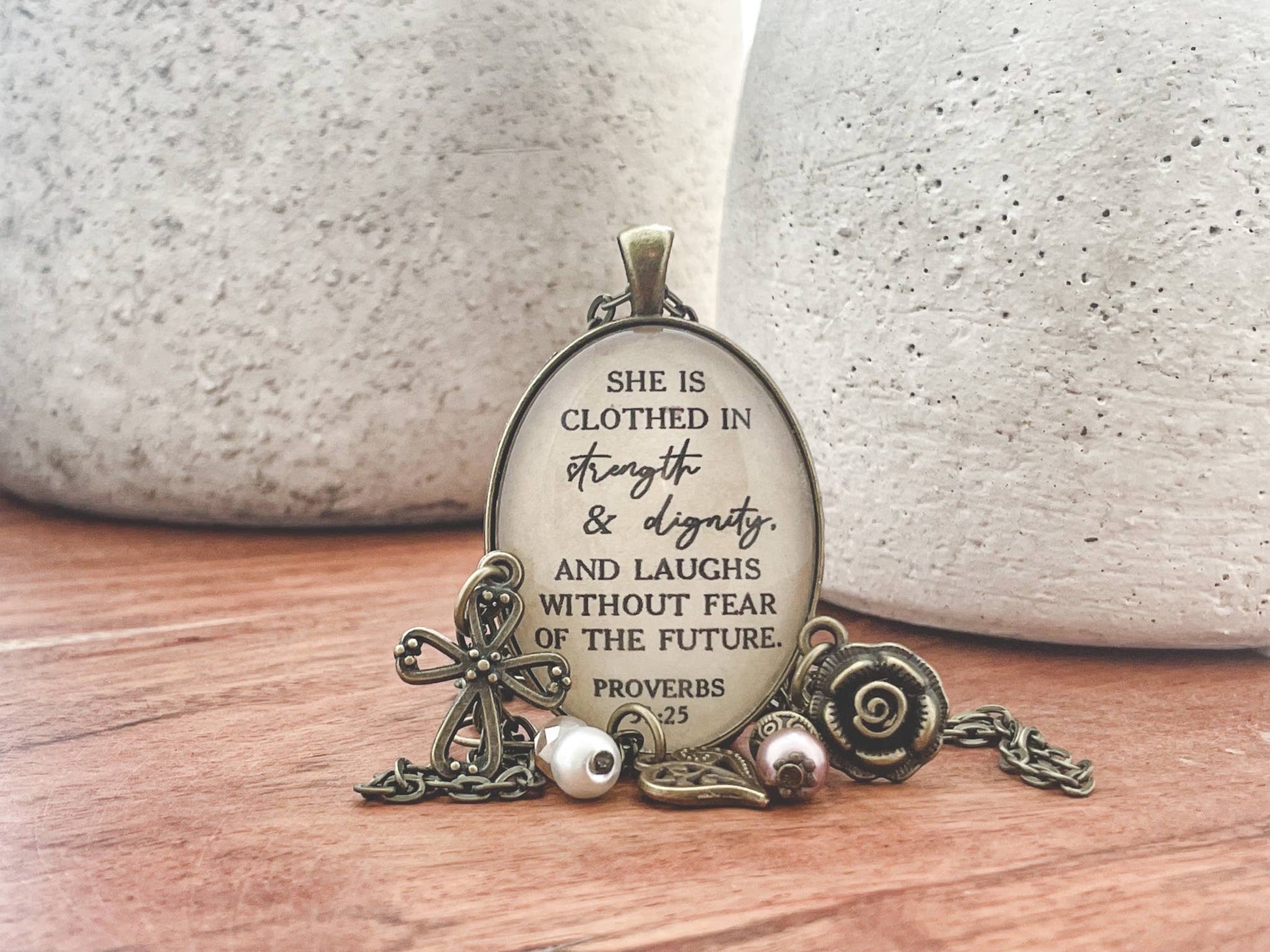Pendant Dimension - approximately 1 1/2 inch x 1 7/8 inch Vintage inspired, scripture pendant perfect for your Christian Bookstore or Boutique. We make a variety of Religious themed jewelry to encourage and inspire your customers. "She is clothed in strength & dignity, and laugh without fear of the future. Proverbs 31:25" Beautiful, handmade necklace comes already packaged and ready for display. *All designs are printed on our hand-dyed paper. Expect variations in the paper background.